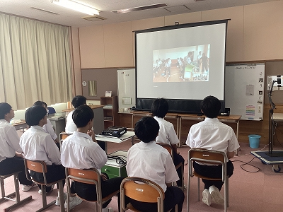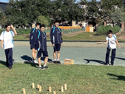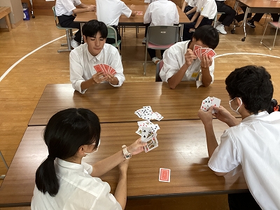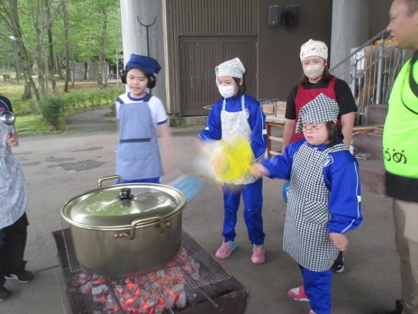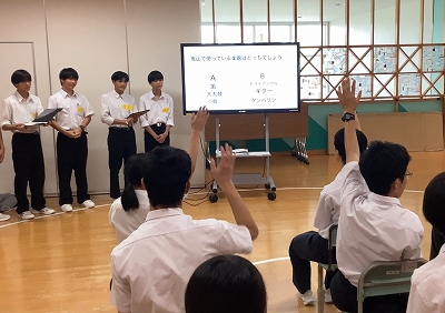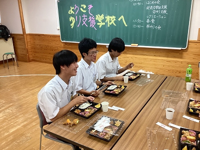 7月10日~11日に一泊二日の日程で実施しました。一日目は「マンタラメの森」のハイキングを行いました。生徒同士が互いに声を掛け、励まし合いながらチェックポイントを目指して歩きました。キャンプファイヤーでは、昨年度の経験や事前学習の実施により、火の女神様とのセレモニーを安全に進めました。その後は、火を囲んでみんなでダンスを踊り、盛り上がりました。二日目は、創作活動としてルームプレートを制作しました。生徒一人一人が事前学習で完成のイメージをもっていたことで、スムーズに活動できました。「もっとやってみよう」という学年テーマの下、昨年度と比べ、リーダーや副リーダーを中心に声を掛け合い、自分の役割を果たす姿が多く見られました。